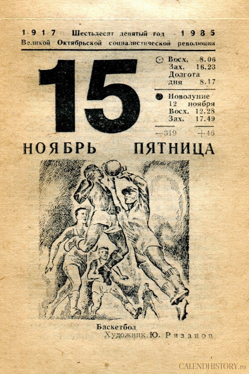 Листок советского отрывного календаря 40-летней давности 15 ноября 1985-го года — Календарь Политиздата Баскетбол. Художник Ю. Рязанов Больше советских отрывных календарей смотрите у нас на сайте - calendhistory.ru https://calendhistory.ru/15-nojabrja-1985-go-goda-kalendar-politizdata/