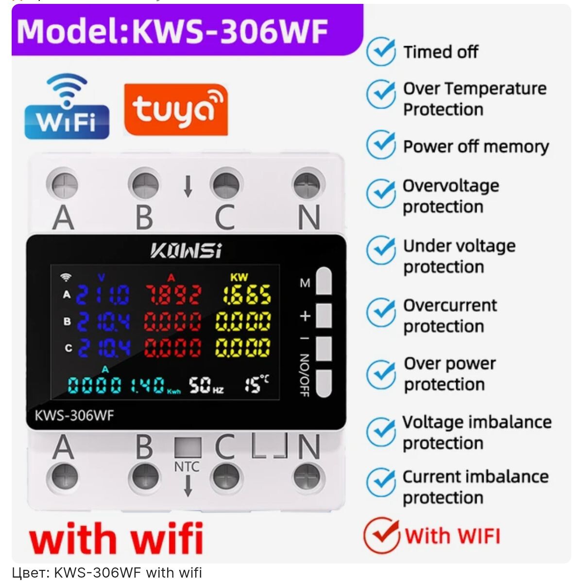 Для tuya подходит исполнение 306wf. Характеристики. Индикация на экране. Габариты. Трехвазная схема включения. Корпус экрана больше чем корпуса автоматов. В щиток не залез. Экраны приложения. Сам прибор яркий и вроде нормально показывает. Внутри реле на 80А. Контакты сделаны нормально. На этом положительные моменты заканчиваются. Очень большая реакция на защиту по напряжению Около 10 секунд. При возврате параметров напряжения- и тока в нормальный режим, прибор автоматически не включается. Только вручную удаленно или кнопкой. Это касается любого режима аварии. У прибора отсутствует автовключение после аварийного срабатывания защиты. Т.е. если отключился, например, по перенапряжению или по перегреву, то включать обратно только руками (кнопкой или удалённо). Нормально работает только если в наличии все три фазы, При пропадании хотя бы одной прибор выключается. При выходе любого из параметров за пределы "уставки" устройство выключает нагрузку. Питание самого прибора только от "