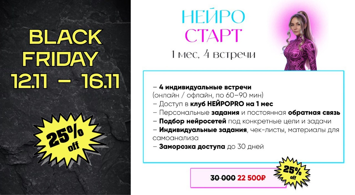 ЛОТ №1 🤩 Наставничество Тариф НЕЙРО СТАРТ Кому подойдёт: Тем, кто хочет спокойно и быстро войти в работу с ИИ без хаоса и перегруза. Если вы на этапе “хочу разобраться и применять”, но не знаете, с чего начать — этот формат даст структуру и экономию времени уже на первом занятии. Какие задачи решит: • выстроит понимание, какие нейросети подходят под ваши цели • поможет внедрить ИИ в ежедневные задачи • сократит рутину на 2–3 часа в неделю • даст ясные, последовательные шаги и обратную связь, чтобы не буксовать 📌 У каждого ученика индивидуальные планы, задания и трекер изучения и прохождения, чтобы отслеживать свой прогресс! Промокод – ПЯТНИЦА 👉 ПРИОБРЕСТИ ЭТОТ ФОРМАТ