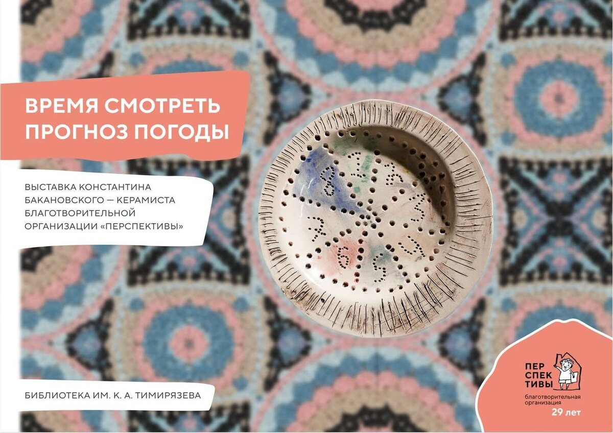 В ноябре в библиотеке им. К. А. Тимирязева открылась выставка керамики Константина Бакановского, художника-керамиста, который умеет замечать красоту в самых обыденных вещах. Костя уже несколько лет занимается керамикой в мастерской «Перспектив» в ДСО «Петергоф». Почерк его работ неповторим, в них есть удивительное сочетание простоты и внимания к деталям. На его тарелках оживают предметы повседневной жизни: чашки, машины, облака. Всё, что обычно проходит мимо взгляда, у Кости становится поводом остановиться и присмотреться. Костя любит наблюдать за течением дней. Каждый день он отмечает дату и записывает прогноз погоды. Так постепенно появился его личный календарь, в котором время движется не по стрелкам часов, а по внутренним состояниям, настроениям, переменам в небе. Это своеобразная хроника — но не событий, а впечатлений. Выставка получила название «Время смотреть прогноз погоды» и приглашает нас сделать то же самое: оглянуться вокруг, заметить оттенки света, облака за окном, усл