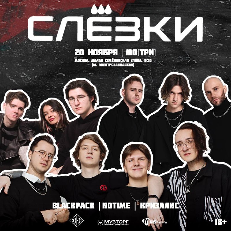 🔥 СЛЁЗКИ — новый проект фестиваля СЛЁЗЫ С 20 ноября 2025 года по 16 апреля 2026 года пройдут 11 концертных вечеринок для молодых и талантливых артистов. Для музыкантов — это возможность выступить, презентовать релиз и найти свою аудиторию. Для лейблов, менеджеров, промоутеров и зрителей — шанс открыть новые имена и почувствовать пульс независимой сцены. Первые СЛЁЗКИ пройдут уже 20 ноября в 19:00 в баре МО[ТРИ] ⚡️ 🔴КРИЗАЛИС 🔴NOTIME 🔴BLACKPACK Вход — свободный на все вечеринки! 📌 Если вы хотите принять участие на следующих вечеринках в качестве артиста — оставляйте заявку по ссылке: vk.cc/cQzd6l