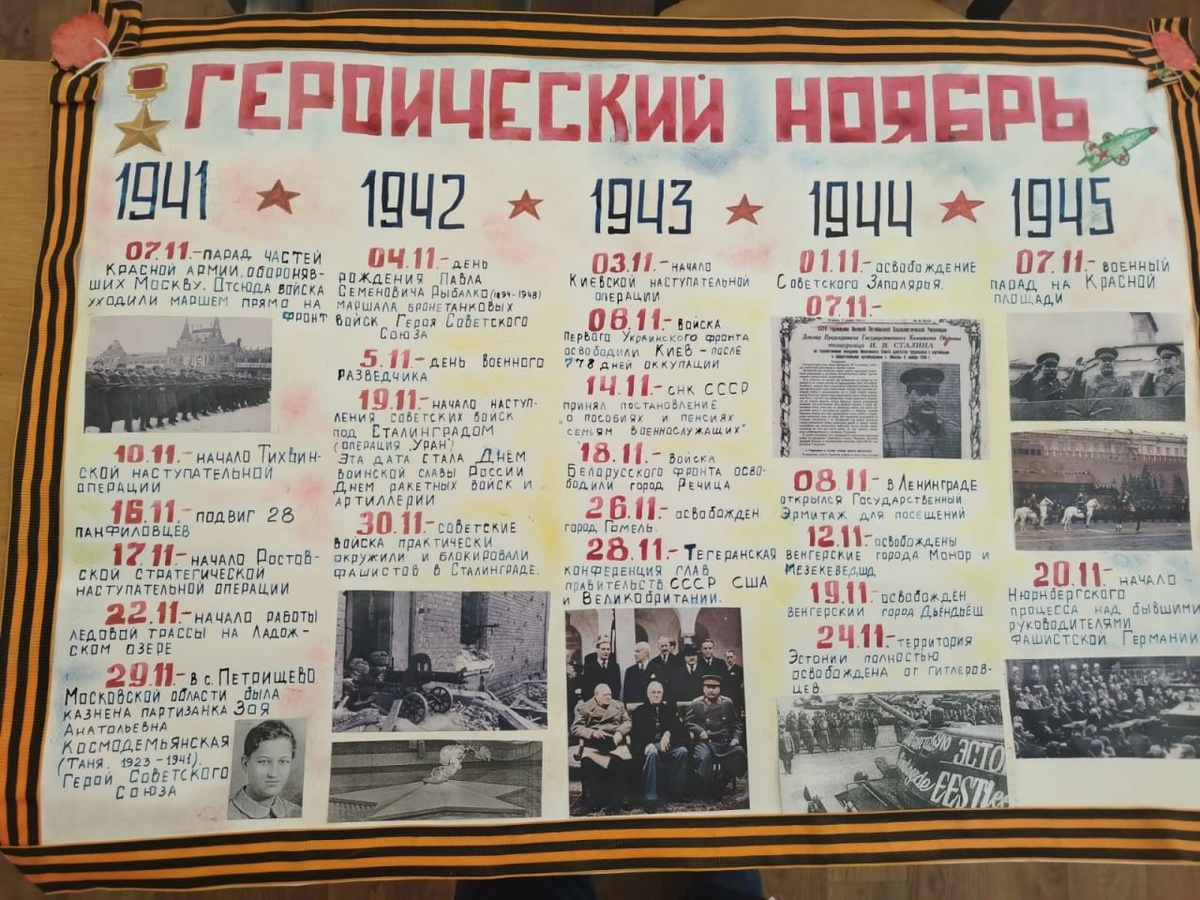 Героический ноябрь В ноябре участники объединения "Хранители истории" Движения Первых приняли участие в акции "Календарь Хранителей истории". Девятиклассницы третьего корпуса школы 1358 София и Анфиса глубоко погрузились в изучение Великой Отечественной войны и создали боевой листок "Героический ноябрь". Софией и Анфисой была проделана огромная работа по изучению сражений периодов Великой Отечественной войны. Боевой листок был разделён на года. Девочки нашли редкие фотографии Нюрнбергского процесса, Парада на Красной площади и отразили их в боевом листке, узнали о Сталинградской битве, Битве за Москву и о подвиге 28 панфиловцев. Спасибо нашим хранительницам за увлеченность проектом «Хранители истории». Наставник исторического направления "Движение Первых" Наталья Владимировна Громова #школа1358 #ДОНМ #ДвижениеПервых #ДвижениеПервыхМосква #ХранителиИстории