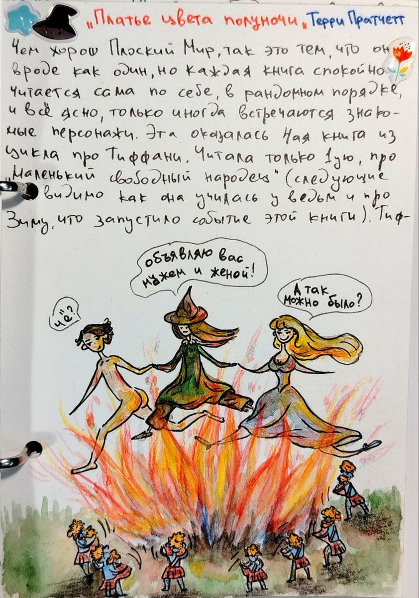 Чем хорош Плоский Мир, так это тем, что он вроде как один, но каждая книга спокойно читается сама по себе, в рандомном порядке, и всё ясно, только иногда встречаются знакомые персонажи. Эта оказалась 4ая книга из цикла про Тиффани. Читала только 1ую, про «маленький свободный народец» (следующие видимо как она училась у ведьм и про Зиму, что запустило событие этой книги). Тиффани уже 16, она полноценная ведьма Меловых Холмов и за ней, всё так же, присматривают Нак-мак-Фиглы. К ним у меня отдельная любовь. Не хотела бы увидеть их в живую, но как сказочные персонажи они великолепны (и говор у них зачётный). Как ведьма Тиффани занимается реальной помощью людям — где уборку сделает, где ногти на ногах бабуле подстрижёт, с болями помогает справиться и подобное. Народу ведьма нужна, но с другой стороны она жеж ведьма, а значит плохая. Сложно. И вот вроде бы всё как обычно, но народ стал злиться. Бабку с котом камнями закидали ибо приняли её за злую колдунью, какие-то мелкие склоки кругом, му