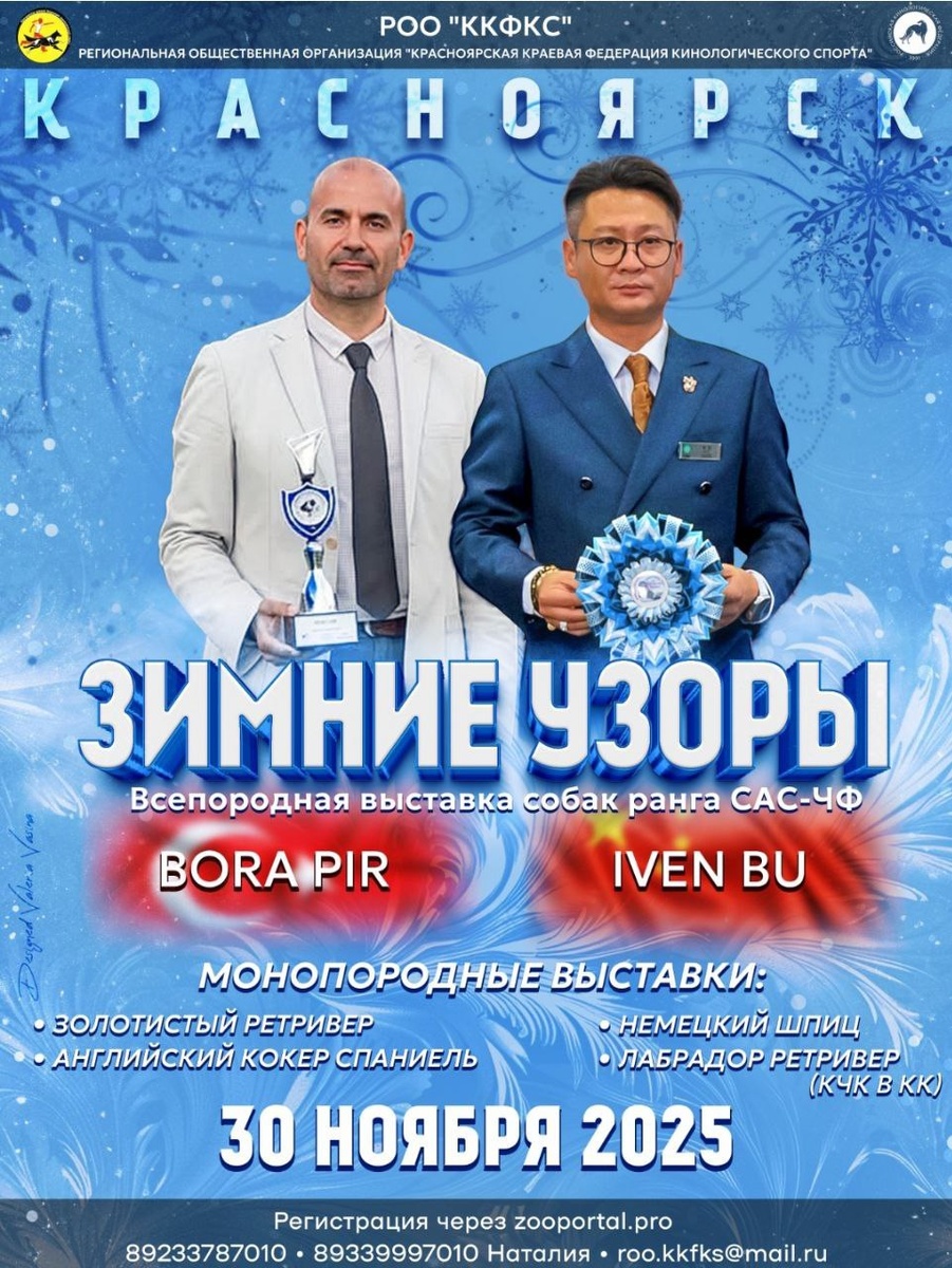 ⏰ 30 ноя (15д) 🏛 #Красноярск #Россия #Выставка 🐶 Выставка собак: Зимние узоры 🏆 Красноярская краевая Федерация кинологического спорта Контакты и вопросы организаторам здесь: 🌐 https://www.petsman.ru/vystavki-sobak.php?mesto=35-krasnoyarsk Всепородная выставка собак ранга САС. ЧФ "Зимние узоры" МОНОПОРОДНЫЕ ВЫСТАВКИ: 💠ЛАБРАДОР РЕТРИВЕР 💠ЗОЛОТИСТЫЙ РЕТРИВЕР 💠НЕМЕЦКИЙ ШПИЦ 💠АНГЛИЙСКИЙ КОКЕР СПАНИЕЛЬ 🧑 👨 Эксперты: 🔹 BORO PIR-Турция 🔹 IVEN BU-Китай 🟣 Тестирование поведения 🔹 Мусаткина Елена Викторовна (Красноярск)