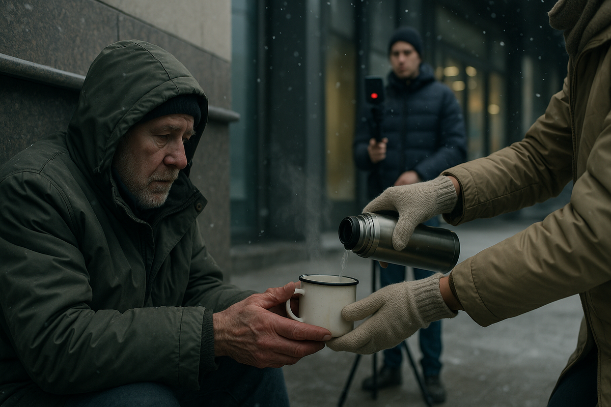 А в это же утро, в соседнем дворе, шла Зоя Петровна — никому не известная соцработница. В сумке у неё звякал термос, лежали чистые носки и пачка бланков. Она направлялась туда, где камер не бывает: к остановке у тёплой вентиляции, где обычно грелся тот самый Андрей. Не ради эфира — ради человека.