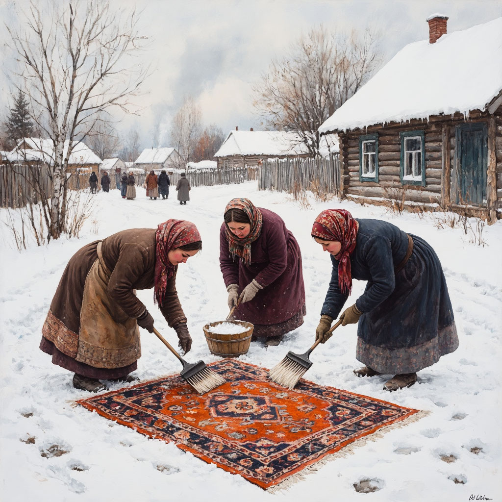 Ещё одним характерным обычаем было выбивание половиков. Замужние женщины делали это для очищения дома от накопившейся пыли и «злых духов», а девушки на выданье — чтобы продемонстрировать свою хозяйственность потенциальным женихам. Выбитый половик нередко расстилали перед входом в дом, надеясь таким образом привлечь внимание желанного юноши. Этот обряд сочетал в себе и бытовую необходимость, и элемент свадебного ритуала.