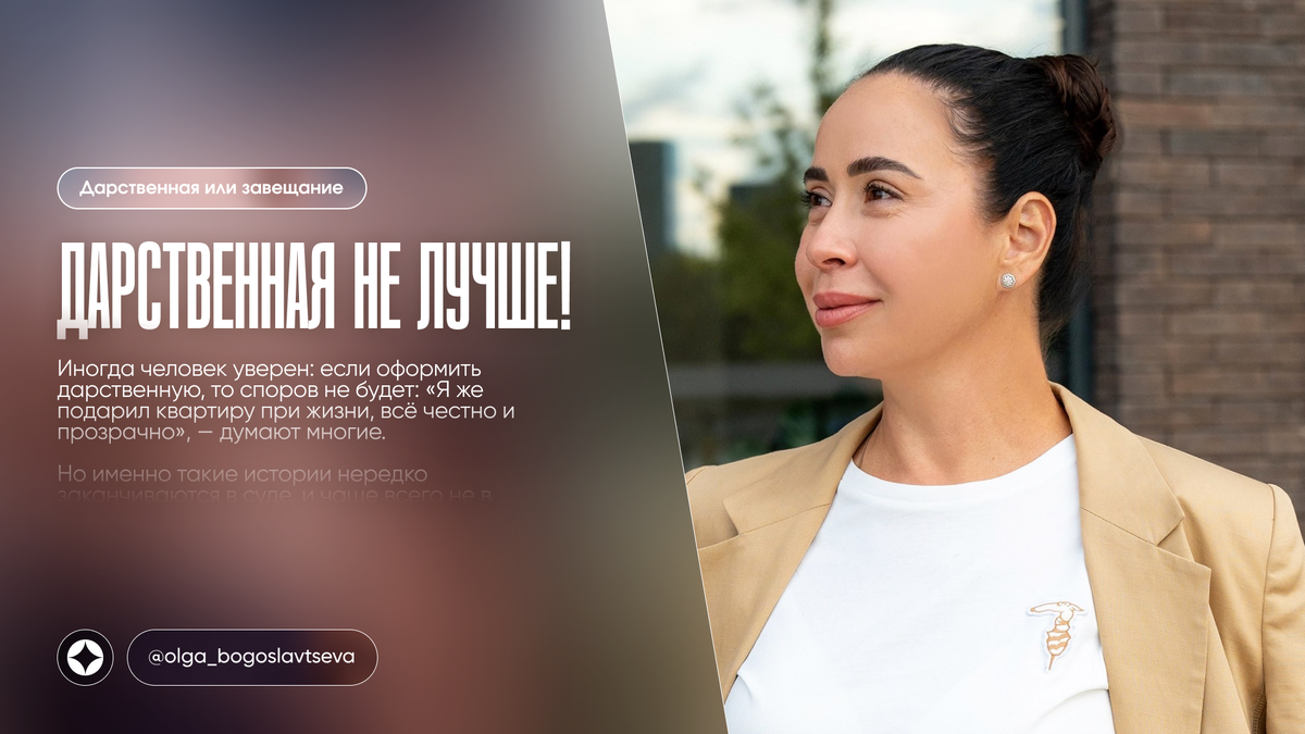 Иногда человек уверен: если оформить дарственную, то споров не будет: «Я же подарил квартиру при жизни, всё честно и прозрачно», — думают многие. Но именно такие истории нередко заканчиваются в суде, и чаще всего не в пользу дарителя! Недавно ко мне обратилась женщина. Несколько лет назад она оформила дарственную на квартиру на сына. Всё было «по-семейному»: без юристов, без условий. Но такое бывает, и через год отношения испортились: сын продал квартиру, а мать осталась на улице. Формально всё законно — дарственная вступила в силу сразу, квартира уже не её, вернуть имущество почти невозможно. В завещании же она могла бы указать условия, поменять решение, отменить распоряжение в любой момент! *️⃣ Дарение — это безвозвратная передача права собственности уже сегодня. *️⃣ Завещание — распоряжение на случай смерти, и до этого момента человек остаётся полноправным владельцем. И если при дарении что-то пошло не так — например, одаряемый проявил насилие, угрозы, или даритель был в состоянии б