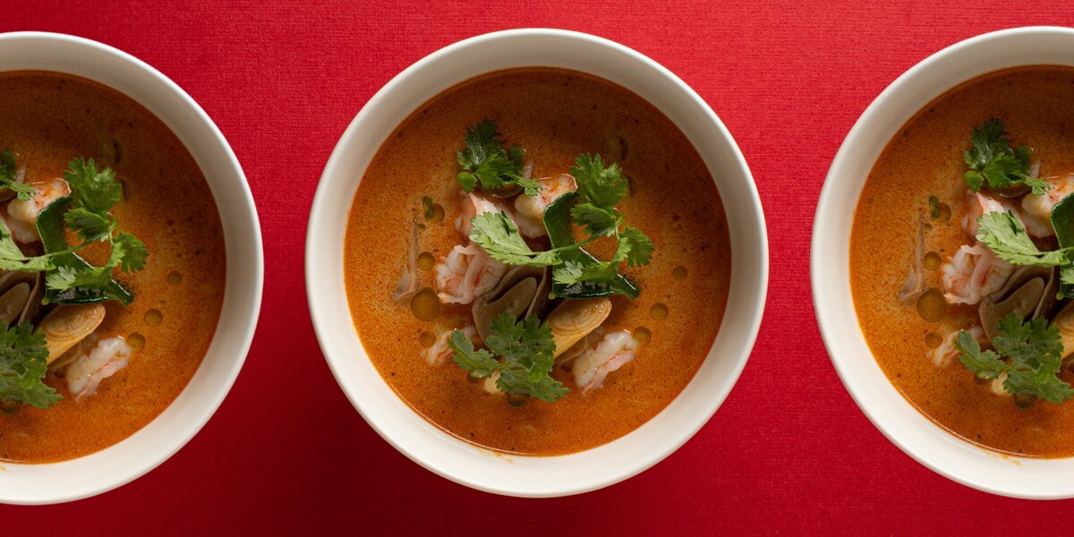 Согреваться холодным ноябрьским днем можно щами и борщами, и это будет прекрасно, но можно также мысленно перенестись в тропики и выбрать суп том-ям — острый, с креветками, крохотными баклажанами и лемонграссом. Собрали 12 мест, где рекомендуем попробовать этот тайский суп. Кутузовский пр-т, 2/1, стр. 1 В этой восточной шкатулке — в полумраке под красной люстрой и рядом с огромными красными колоннами — том-ям делают с кокосовым молоком, курицей, креветками и тайскими баклажанами (1 100 рублей). Такой острый суп точно согреет холодной осенью. Смоленская пл., 3 Том-ям с японским рисом (990 рублей) — классика паназиатского ресторана на первом этаже «Смоленского пассажа». Понравится любителям острых блюд. ул. Большая Никитская, 23/9 Небольшое, но давно любимое модной публикой кафе на углу в начале Большой Никитской. Здесь в том-ям (1 110 рублей) добавляют грибы шимеджи и кукурузу. Получается насыщенный и яркий вкус. ул. Охотный Ряд, 2 Суп том-ям (1 600 рублей) в этом ресторане готовят по к