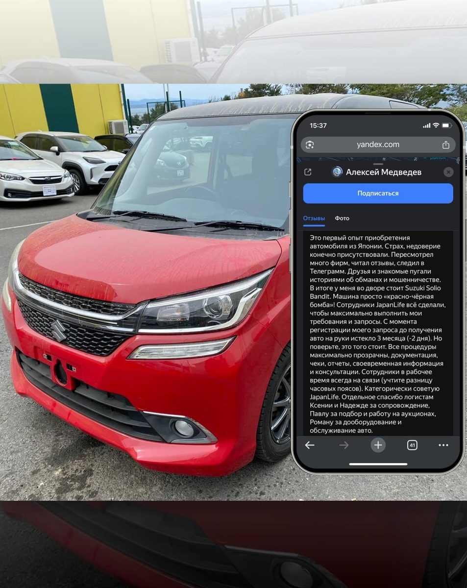 ОТЗЫВЫ О НАШЕЙ РАБОТЕ Привезли для нашего клиента Suzuki Solio Bandit и получили отличный отзыв: "Это первый опыт приобретения автомобиля из Японии. Страх, недоверие конечно присутствовали. Пересмотрел много фирм, читал отзывы, следил в Телеграмм. Друзья и знакомые пугали историями об обманах и мошенничестве. В итоге у меня во дворе стоит Suzuki Solio Bandit. Машина просто «красно-чёрная бомба»! Сотрудники JapanLife всё сделали, чтобы максимально выполнить мои требования и запросы. С момента регистрации моего запроса до получения авто на руки истекло 3 месяца (-2 дня). Но поверьте, это того стоит. Все процедуры максимально прозрачны, документация, чеки, отчеты, своевременная информация и консультации. Сотрудники в рабочее время всегда на связи (учтите разницу часовых поясов). Категорически советую JapanLife. Отдельное спасибо логистам Ксении и Надежде за сопровождение, Павлу за подбор и работу на аукционах, Роману за дооборудование и обслуживание авто." Благодарим за доверие и будем