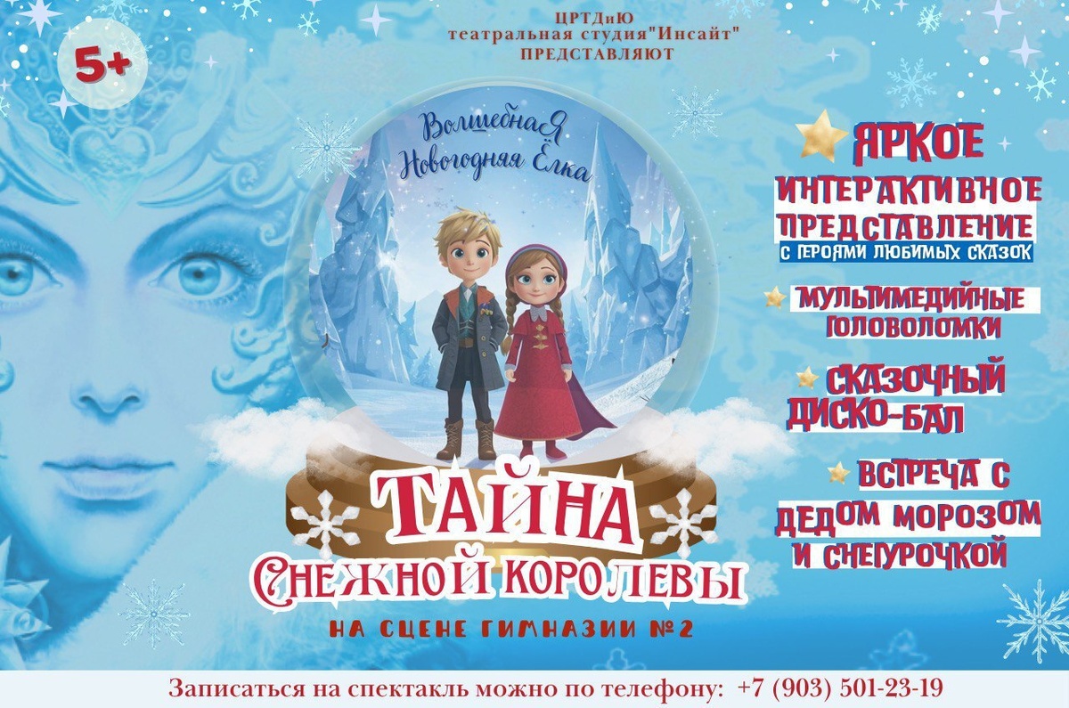 ✨ Интерактивное представление "Тайна Снежной королевы"👑💎❄️ Вас ждут мультимедийные головоломки📲, диско-бал💃, встреча с Дедом Морозом и Снегурочкой🎅👳. ⏰Количество мест ограничено. ✍️Коллективные заявки принимаются по тел 8-903-501-23-19 Елена Сергеевна (пишите сообщения в Whats App) 🚫 Возраст: 3+ 🏢 Центр развития творчества детей и юношества 📍 г. Чехов, ул. Чехова, д.27 💰 Цена: 455 ₽ ⭐Поддержать канал голосом ✅ Мероприятия Чехов https://dzen.ru/id/66cc4b48e9ef144699238a51 http://vk.com/chekhov_events http://dzen.ru/chekhov_events