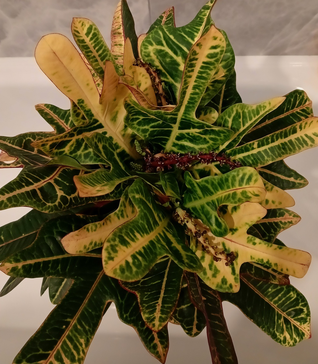 Кротон появился у меня случайно, лет 7 назад. И тогда я верила, что он принесет мне удачу, процветание, семейное счастье и успех в карьере:) Я не суеверна, но всё же ☺️ Считается, что кротон защищает дом от негативной энергии и помогает в бизнесе. Вообще, я избегала заводить комнатные цветы, так как у нас квартира была на первом этаже и очень темная, даже во второй половине дня света было недостаточно. Но кротон мне подарили на день рождения и, очень хотелось, чтобы он всё-таки прижился. Видимо, в такой полутени кротону было хорошо, потому что он активно рос, междоузлия были не более 5 см, поэтому ствол не оголялся, и цветок был достаточно пышный. Только окраска была не совсем декоративной, а больше темно-зеленой. По фотографиям можно проследить, как изменился цвет листьев. Кротон родом из тропиков Юго-Восточной Азии и Океании, поэтому любит влажность, опрыскивания и душ. Но я этим всем его не баловала, да и воздух в квартире был чаще сухой. К тому же горшок с растением стоял на подоко