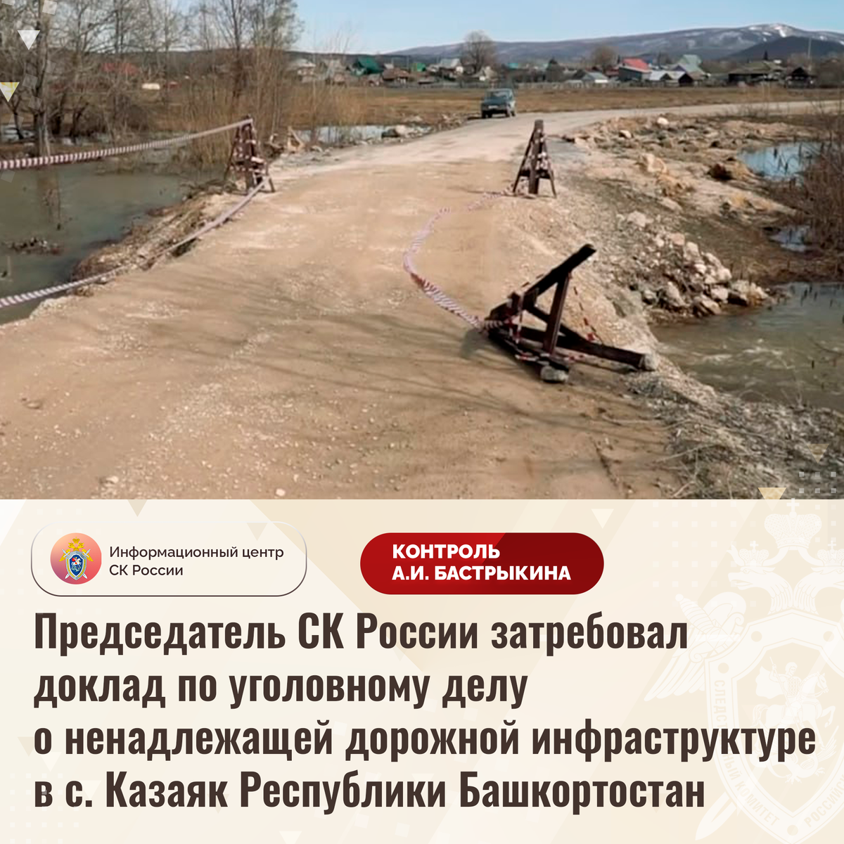 Председатель СК России затребовал доклад по уголовному делу о ненадлежащей дорожной инфраструктуре в с. Казаяк Республики Башкортостан В комментариях в аккаунте приёмной Председателя СК России А.И. Бастрыкина «ВКонтакте» опубликованы обращения по вопросу несогласия с ходом установления обстоятельств нарушения прав жителей села Казаяк Республики Башкортостан на качественную дорожную инфраструктуру. На протяжении длительного времени автомобильный мост через реку Ашинку находится в непригодном состоянии: конструкции деформировались, ограждения частично обрушились, полотно подъездной дороги сужено и осыпается. Кроме того, при подъеме уровня воды в реке сооружение затапливается, что приводит к опрокидыванию автомобилей. В связи с этим проезд транспортных средств затруднен, а местные жители лишены возможности беспрепятственно добраться до других населенных пунктов, где расположены социальные учреждения. Многочисленные обращения в компетентные органы результатов не принесли. Ранее указанная