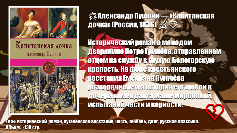 О чем: Молодой дворянин Пётр Гринёв отправляется на службу в глухую крепость, где его ждёт пугачёвский бунт, испытание чувств к Маше Мироновой и встреча с загадочным казаком Емельяном Пугачёвым.