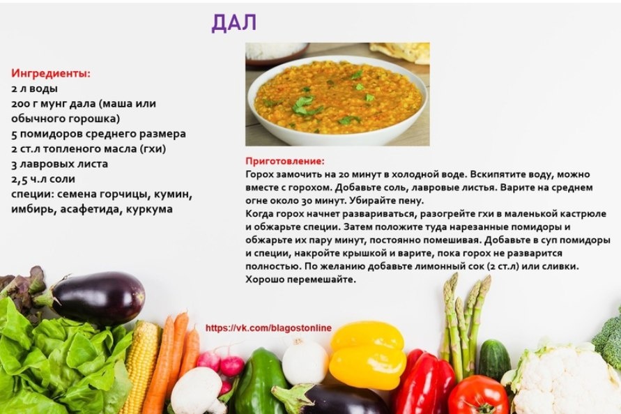 🍲 ДАЛ 🌀 Ингредиенты: 2 л воды 200 г мунг дала (маша или обычного горошка) 5 помидоров среднего размера 2 ст.л топленого масла (гхи) 3 лавровых листа 2,5 ч.л соли специи: семена горчицы, кумин, имбирь, асафетида, куркума 🌀 Приготовление: Горох замочить на 20 минут в холодной воде. Вскипятите воду, можно вместе с горохом. Добавьте соль, лавровые листья. Варите на среднем огне около 30 минут. Убирайте пену. Когда горох начнет развариваться, разогрейте гхи в маленькой кастрюле и обжарьте специи. Затем положите туда нарезанные помидоры и обжарьте их пару минут, постоянно помешивая. Добавьте в суп помидоры и специи, накройте крышкой и варите, пока горох не разварится полностью. По желанию добавьте лимонный сок (2 ст.л) или сливки. Хорошо перемешайте.