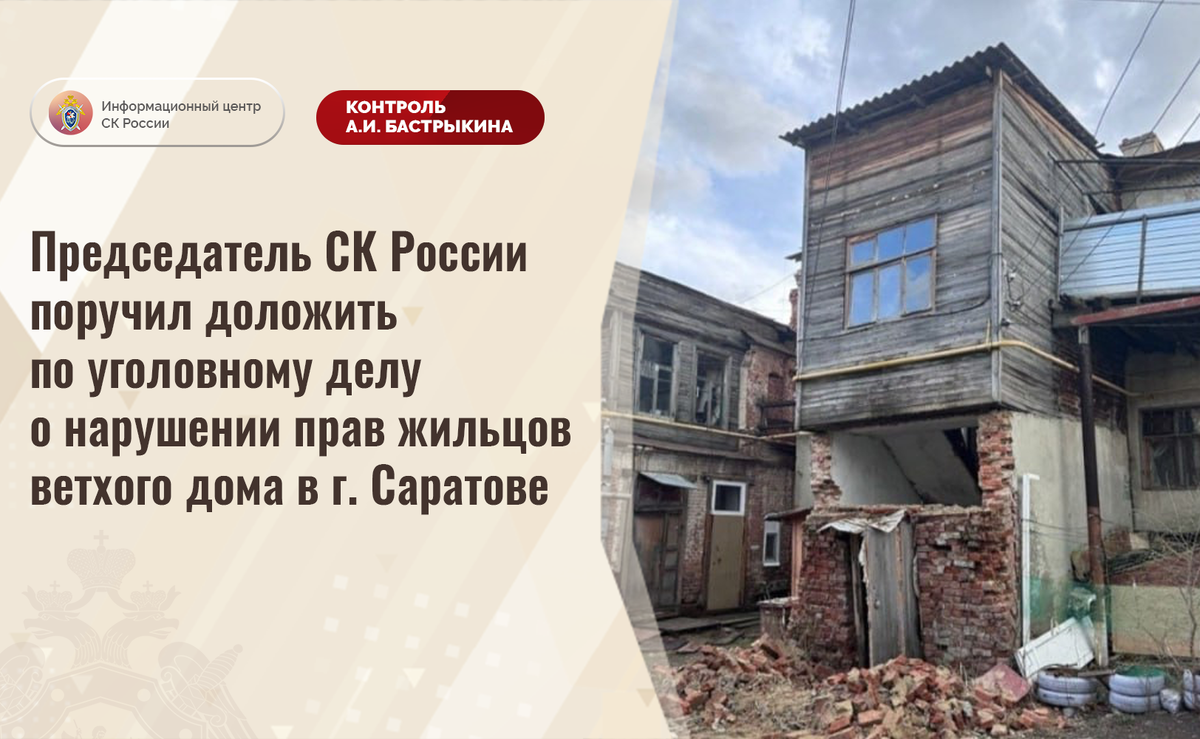 Председатель СК России поручил доложить по уголовному делу о нарушении прав жильцов ветхого дома в г. Саратове В комментариях в аккаунте приёмной Председателя СК России А.И. Бастрыкина «ВКонтакте» размещено обращение по вопросу несогласия с ходом установления обстоятельств нарушения прав жильцов дома на улице Московской города Саратова, являющегося объектом культурного наследия регионального значения «Доходный дом с флигелями и пристроями 1830-е годы, 1860-е годы». Здание состоит из шести строительных литеров, пять из которых признаны аварийными из-за разрушающихся стен и кровли. Однако литер, в котором проживает заявитель, а также пенсионеры и семьи с детьми, несмотря на аналогичные нарушения, до настоящего времени надлежащим образом не обследован и аварийным не признан, ввиду чего жильцы вынуждены находиться в небезопасных условиях. Обращения в компетентные органы результатов не принесли. Указанная ситуация освещалась в СМИ и социальной сети. А.И. Бастрыкин поручал представить по не