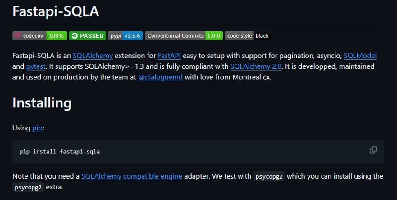 🖥 fastapi‑sqla — это расширение для FastAPI, которое упрощает интеграцию с SQLAlchemy и обеспечивает поддержку пагинации, asyncio, SQLModel