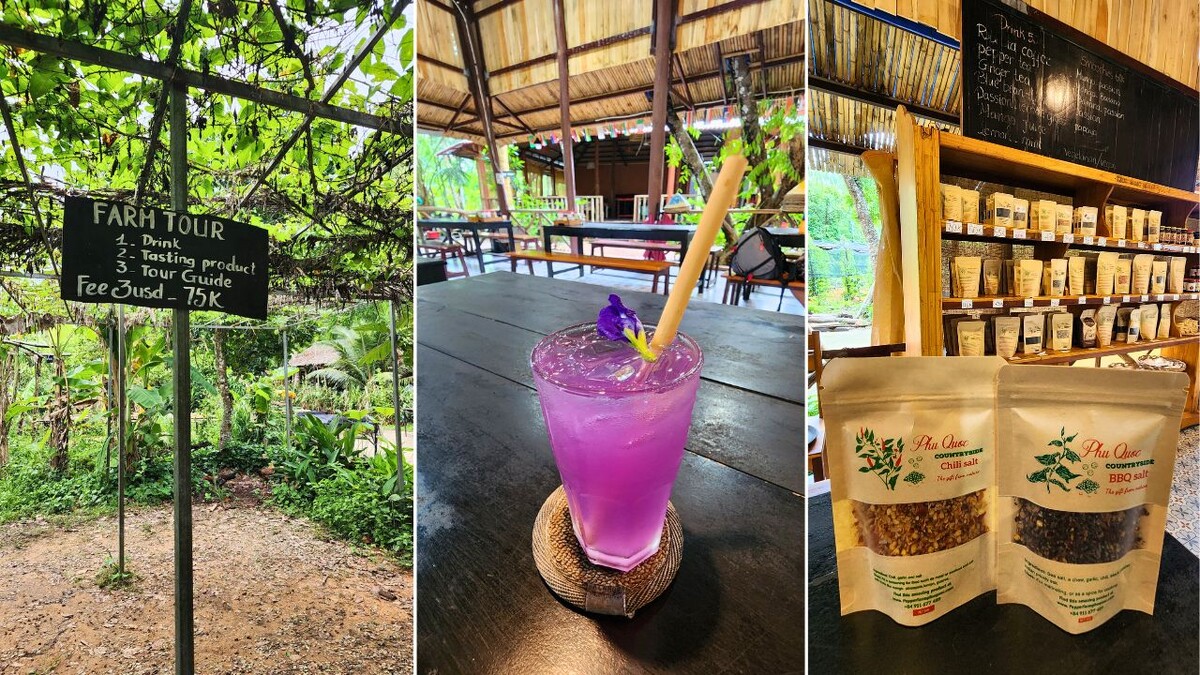 На самом острове ферм много, и это не один-два «инстаграмных» поля. Перец выращивают в основном в районе коммун Cua Duong, Cua Can и Duong To, чуть в глубине от туристических зон. Есть более «раскрученные» места вроде Khu Tuong, Phu Quoc Countryside, Duc Ninh, Ngoc Ha, где для туристов делают мини-экскурсии, дегустации и продают красиво упакованные наборы. Есть и маленькие семейные хозяйства без вывесок и туров — просто ряды перца за домом, куда можно заглянуть по дороге, поздороваться с хозяевами и купить перец «с грядки». Формат везде плюс-минус один: прогулка между столбами лиан, рассказ о том, как выращивают и сушат ягоды, потом стол с баночками и тарелочками для дегустации и небольшой магазинчик.
