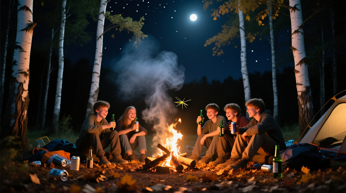 Самогон в поллитровке таял. Ночь сгущалась, и луна, выглянув из-за туч, отбрасывала длинные, корявые тени от берёз. Они становились похожи на скрюченные пальцы, тянущиеся к нашей компании.