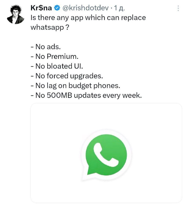 Пользователи Twitter обозначили преимущества WhatsApp: — Отсутствие рекламы; — Нет функций премиум-версии; — Интерфейс остается простым и удобным; — Не приходится мириться с принудительными обновлениями; — Приложение работает без лагов на бюджетных устройствах; — Не нужны объемные обновления по 500 МБ. Звучит, как реклама кнопочного телефона для бабушки. При этом стоит учитывать, что приложение принадлежит Meta, подверженной запрету и обвиняемой в терроризме. Возможно, даже за этим скрываются более темные дела. Постмейкер - автоматическое ведение канала 🤖 Анимация | СhatGPT-4 | Помощь с резюме