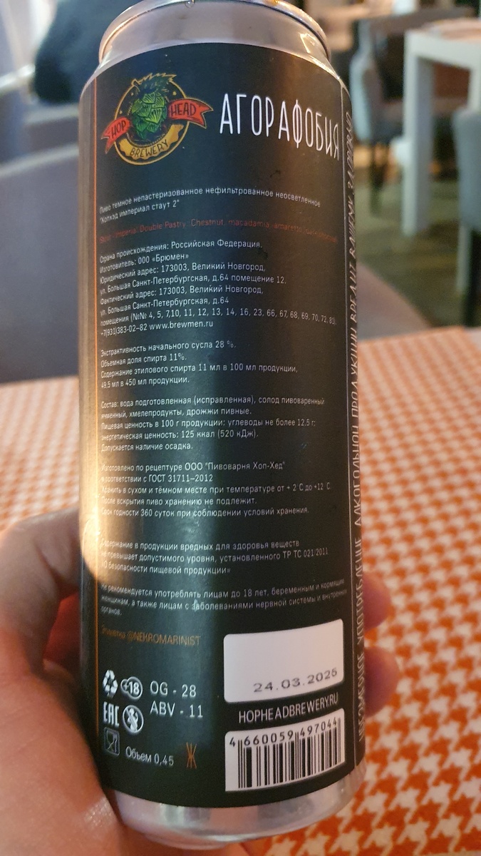 "Теория большого пива 4" Stout Imperial Double Pastry (chestnut, macadamia, amaretto и шоколадом). Объём - 0,45 литра. Алкоголь - 11 %. Плотность - 28 %. Горечь - неизвестна. Брал в "BRUGGER" (г. Воронеж) Хмели - неизвестны. Печеньковый пастри стаут с каштаном, макадамией, амаретто и шоколадом. Взял на пробу и ... каково было моё удивление, когда попробовав понимаю, что я его уже пил. Хотя взял впервые! Понимаю, что вкус очень знакомый. Начинаю читать этикетку сзади и ... понимаю, что изготовителем является пивоварня BRUMEN, г. Великий Новгород! И напоминает он пиво "Высокомерный" от Брюмена! Только с другой этикеткой! Есть линейка пастри стаутов от Брюмена это Высокомерный, Надменный и Заносчивый. Вот это как раз Высокомерный! Рекомендую однозначно! И как это пиво и как его брата близнеца. Это вкусно!