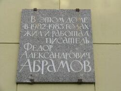 Мемориальная доска в Санкт-Петербурге на стене дома 1 по Мичуринской улице: «В этом доме в 1982—1983 годах жил и работал писатель Фёдор Александрович Абрамов»