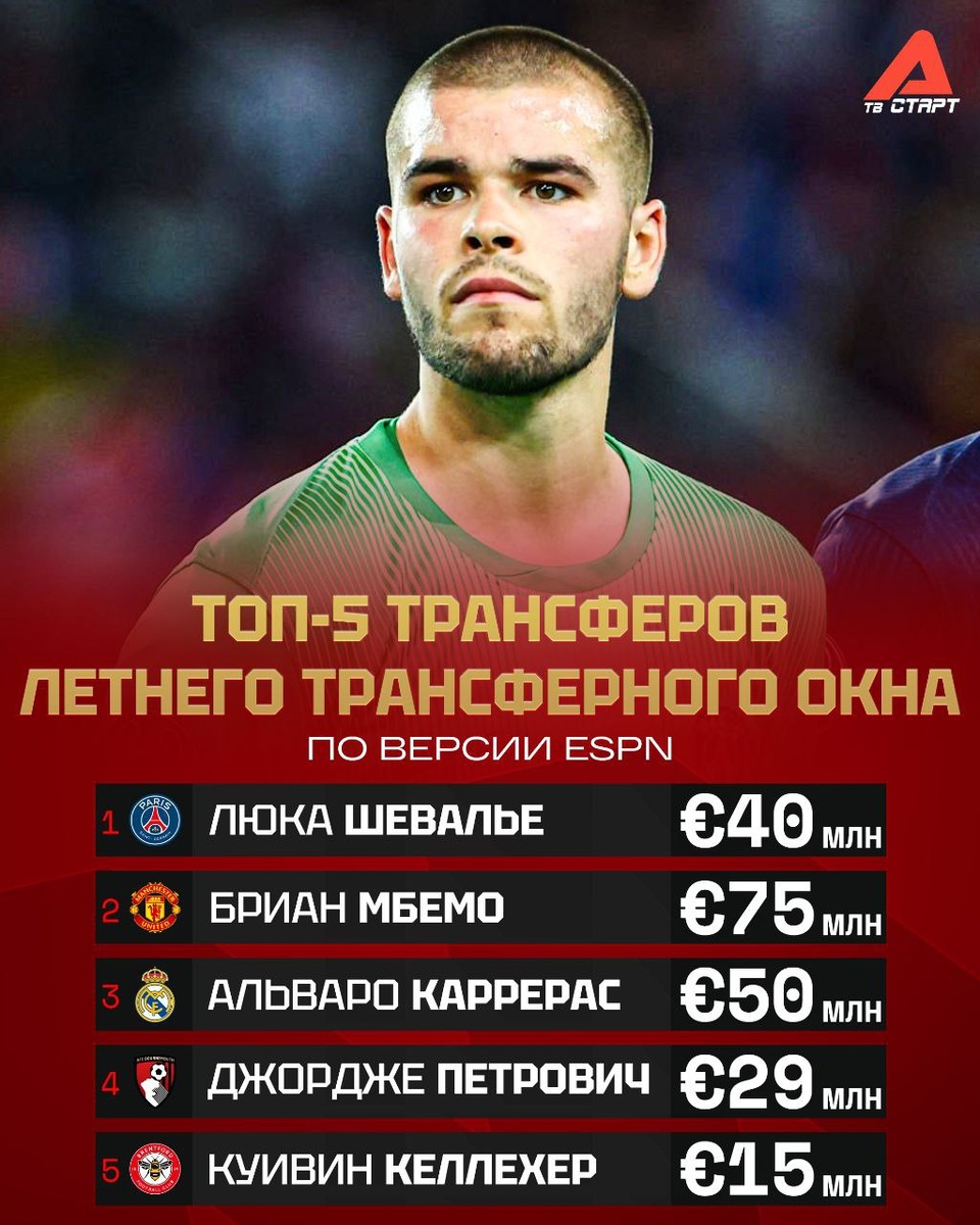 🧤🔝 Шевалье – лучший трансфер летнего окна Хотя многие болельщики парижан с этим не согласны после ошибок Люки. Также в топ-5 вошел переход Альваро Каррераса из «Бенфики» в «Реал». Как вам такой топ-5, все справедливо? 🤔 Подписывайся на ТВ СТАРТ в MAX📲