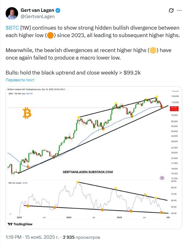 Недельный график BTC продолжает демонстрировать сильный скрытый бычий дивергенс между каждым более высоким минимумом (🟠) начиная с 2023