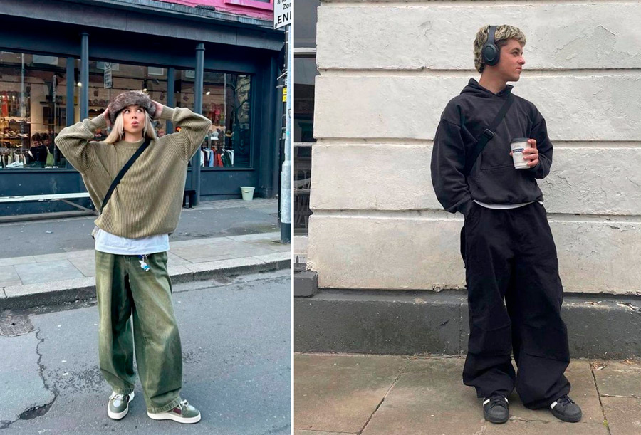 - Широкие брюки и джинсы. Подростки носят большие спортивные брюки, карго, джоггеры и джинсы свободного кроя с топами или футболками, создавая баланс между объемным низом и облегающим верхом.