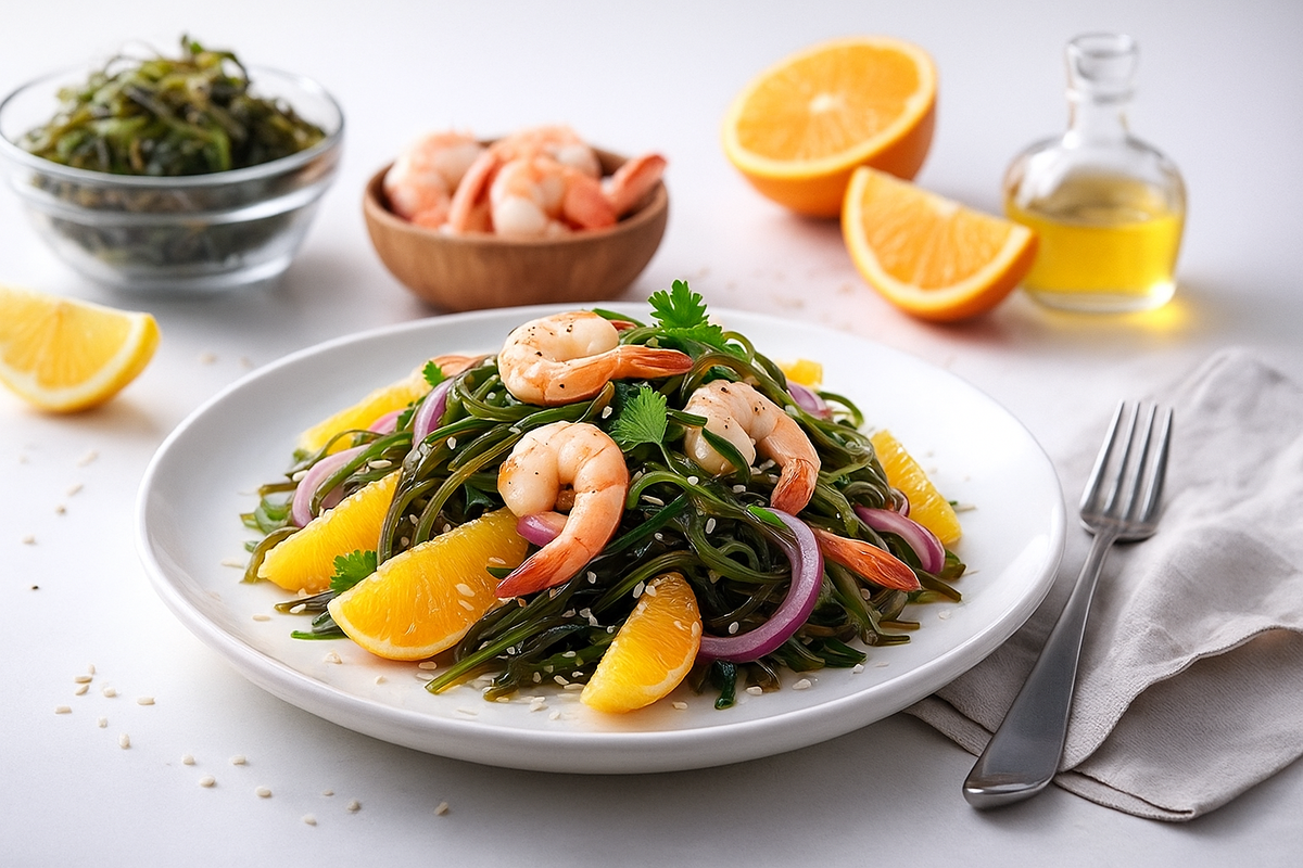 Праздничный салат с морской капустой, креветками и цитрусовой заправкой: блюдо, которое удивит гостей