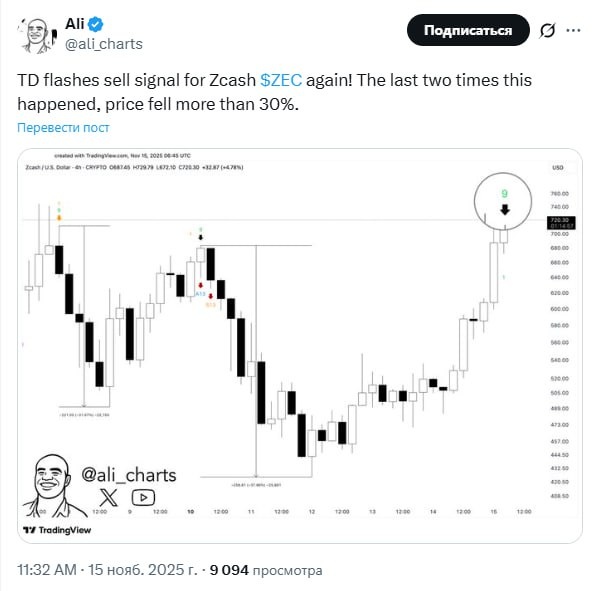Индикатор TD Sequential снова подает сигнал на продажу для Zcash! В последние два раза, когда это происходило, цена падала более чем на 30