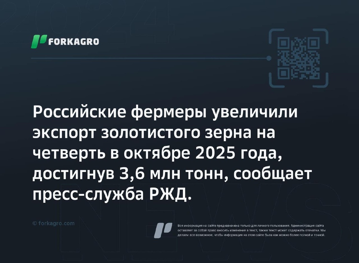 Российские фермеры увеличили экспорт золотистого зерна на четверть в октябре 2025 года, достигнув 3,6 млн тонн, сообщает пресс-служба РЖД