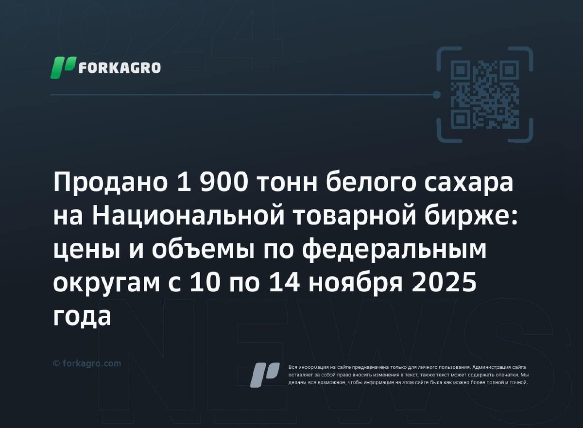Продано 1 900 тонн белого сахара на Национальной товарной бирже: цены и объемы по федеральным округам с 10 по 14 ноября 2025 года С 10 по 14 ноября 2025 года на Национальной товарной бирже и СПбМТСБ было продано 1 900 тонн белого сахара. Средняя цена — 47 375 руб./тонна. Продажи с условиями ФО: в Центральном федеральном округе – 1 740 тонн по цене 47 420 руб./тонна, в Приволжском федеральном округе – 160 тонн по цене 46 888 руб./тонна. Перейти к источнику