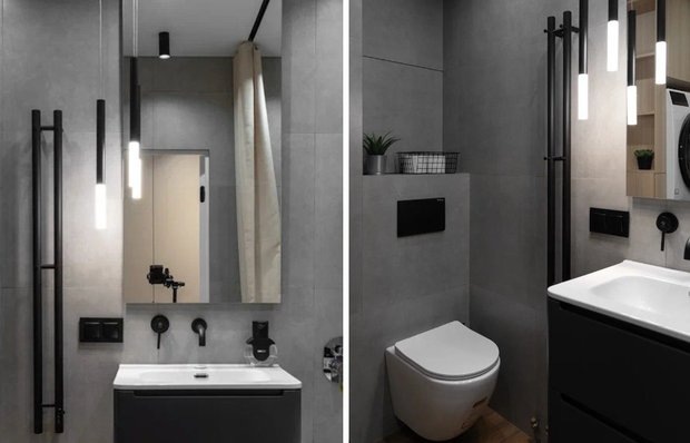 Компактное пространство превратили в функциональный и стильный санузел с индустриальными акцентами В этой квартире дизайнер Алиса Кащеева продумала сразу два санузла: гостевой и основной. Решение оказалось крайне удобным для молодого владельца, который часто принимает гостей. Каждый санузел выполнен в едином стиле с остальной квартирой — строгом, брутальном, с акцентом на текстуры и свет. Основной санузел площадью всего 4 м² потребовал внимательной проработки деталей: важно было уместить все необходимое, не перегрузив пространство. В итоге получилось создать интерьер, где функциональность сочетается с минимализмом и эстетикой. Ванная комната выполнена в палитре, которая подчеркивает индустриальный характер всего проекта. Для отделки стен выбрали крупноформатный керамогранит под бетон, а нижнюю часть выделили плиткой под дерево, создающей теплый контраст. Санузел оборудован современной подвесной сантехникой, которая экономит место и облегчает уборку. Черные смесители и аксессуары создаю