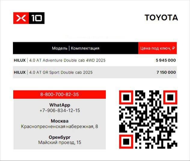 💸 Обновили цены на TOYOTA HILUX (2025). На видео версия — Adventure Double Cab. Чтобы узнать подробнее об этой комплектации, перейдите по этой ссылке 🇦🇪 Авто из ОАЭ, цены указаны с учётом растаможки и доставки в Москву Хотите убедиться в надежности нашего сервиса? Изучите отзывы наших счастливых клиентов! 📞 8 800 700-82-35 📞 8 919 868-97-47 Иван 💬 WhatsApp 💙 Сообщество в VK 📍Оренбург, проезд Майский, 15 📍Москва, Краснопресненская набережная, 8 #toyotahilux #автоподзаказ #x10ОАЭ #x10прайс