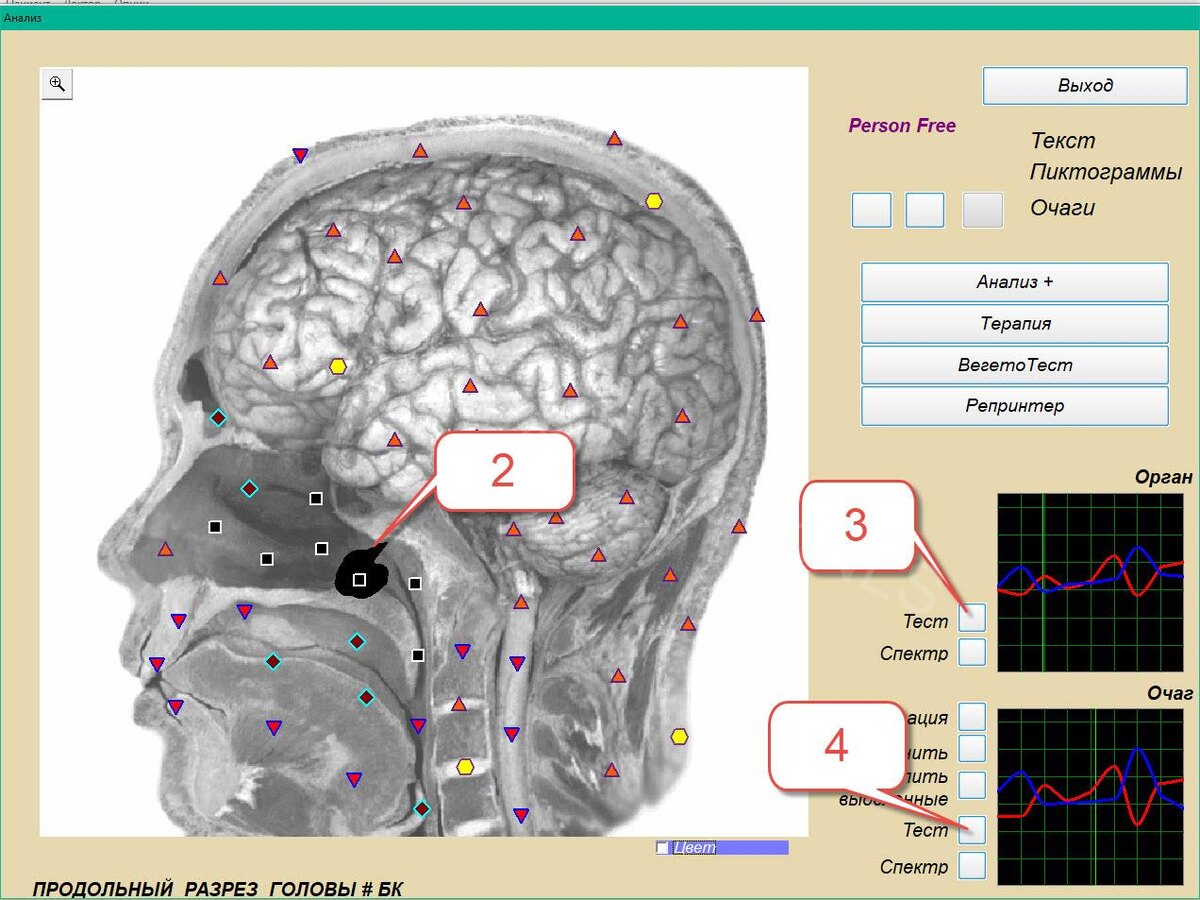 Пациент почти без жалоб. Насморк, урчание в животе, недомогание, вялость. Все, как у всех. Выбрав необходимые срезы для диагностики, соответствующие жалобам пациента и нашими планами на исследование, мы снимаем информацию. После оценки первичного результата, дообследуем очаги, используя технологию «Контур» и приступаем к анализу срезов с выявленными нарушениями. На рис. 1, на срезе «Продольный разрез головы» обращает на себя выраженная патология в носо-глотке – 2. Следует провести тест как всего среза, нажав – 3, так и тест очага – 4. По завершению тестирования, мы попадаем на экран «Группы эталонов» - см. рис 2. Перечень в «Группе Эталонов» - это набор диагностических и лечебных возможностей аппарата, от разнообразия которого также определяется место этого аппарата в классификации NLS аппаратуры. В Маджерике их 15. При выборе конкретного пункта в «Группе эталонов» - 6, выпадает в «Списке эталонов» - 5 перечень соответствий ( диагнозам, значениям, лечебным препаратам и пр.) с указа