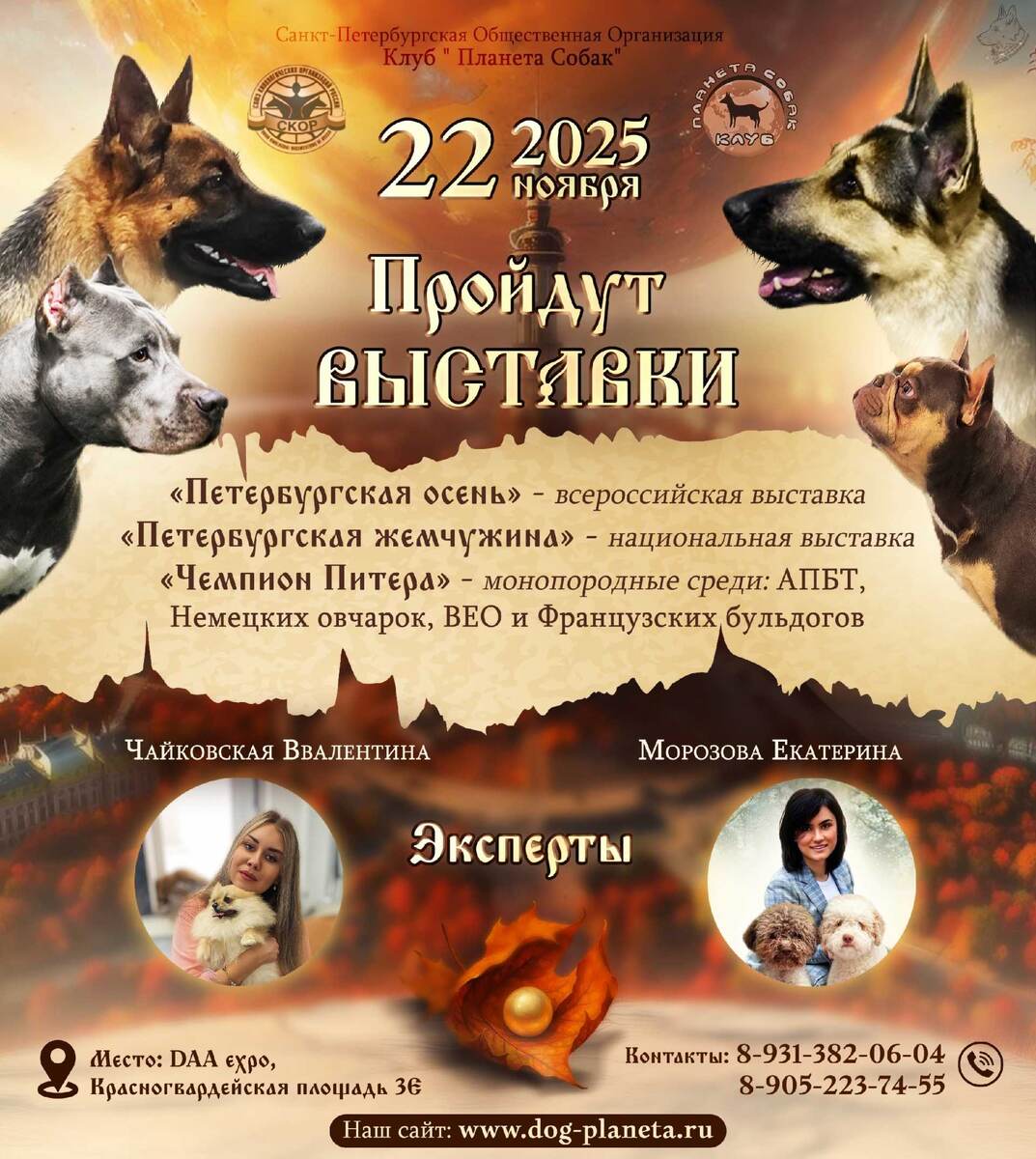 ⏰ 22 ноя (7д) 🏛 #Петербург #Россия #Выставка 🐶 Выставка собак: ПЕТЕРБУРГСКАЯ ОСЕНЬ 🏆 Клуб "Планета собак" Контакты организаторов здесь: 🌐 https://www.petsman.ru/vystavki-sobak.php?mesto=58-sankt-peterburg "ПЕТЕРБУРГСКАЯ ОСЕНЬ" Всероссийская выставка "ПЕТЕРБУРГСКАЯ ЖЕМЧУЖИНА" Национальная выставка ЧЕМПИОН ПИТЕРА монопородные среди АПБТ, Нем. овчарки, ВЕО, Французский бульдог