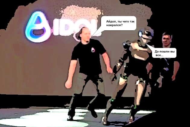 Выход на сцену нашего, исконно русского робота по имени "Айдола", созданного компанией «Новая технологическая коалиция» не обошелся без некоторого казуса. Выйдя под свет софитов, робот сделал несколько неверных шагов и упал, хотя его и пытались держать под руки.