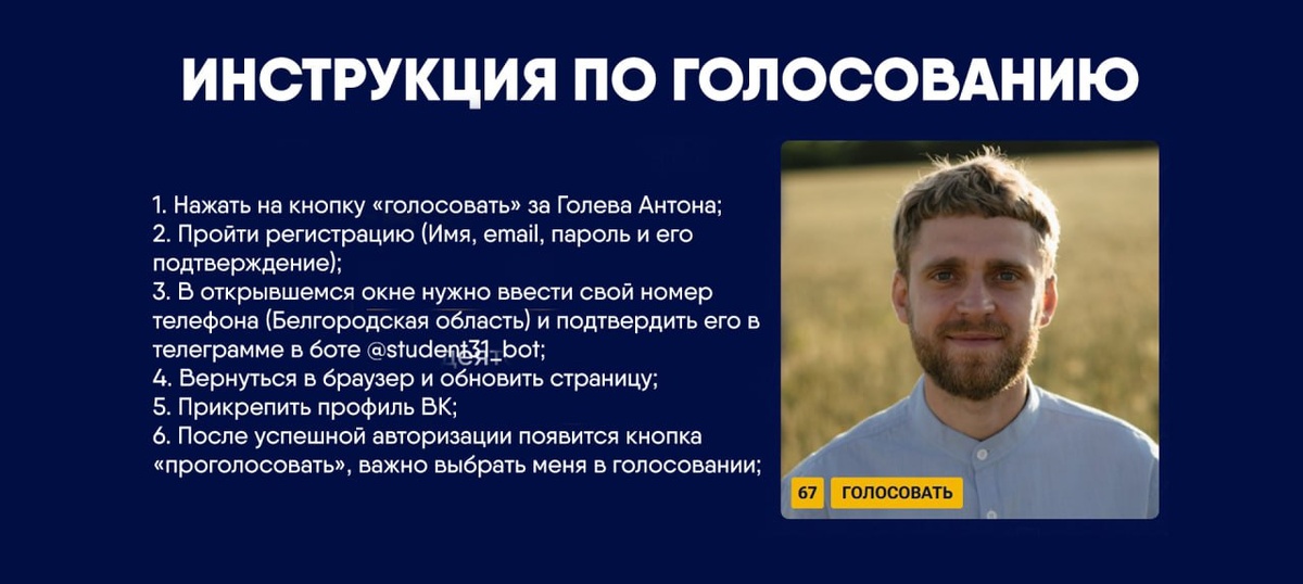 Ссылка на голосование: студентгода.рф/vote/a.golev Инструкция по голосованию: 1. Перейти по ссылке: студентгода.рф/vote/a.golev нажать на кнопку «голосовать» за Голева Антона; 2. Пройти регистрацию (Имя, email, пароль и его подтверждение); 3. В открывшемся окне нужно ввести свой номер телефона (Белгородская область) и подтвердить его в телеграмме в боте @student31_bot; 4. Вернуться в браузер и обновить страницу; 5. Прикрепить профиль ВК; 6. После успешной авторизации появится кнопка «проголосовать», важно выбрать меня в голосовании; *Это подробная инструкция с сайта со скриншотами: студентгода.рф/howtovote Каждый голос имеет значение, готов благодарить каждого! Пиши в личные сообщения по вопросам голосования за меня.