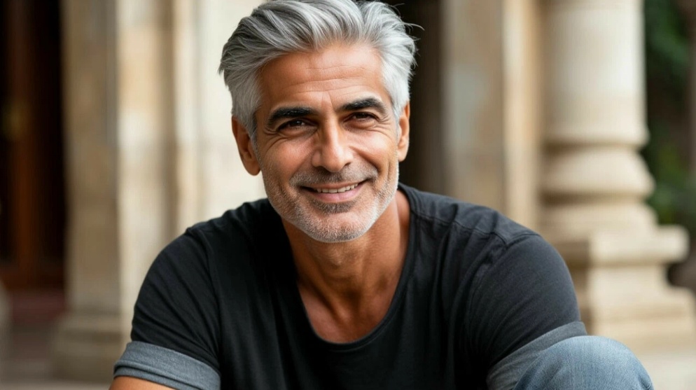 Оборачиваясь, обе увидели стройного, подтянутого мужчину с элегантной сединой на висках. Улыбка у незнакомца была доброй и открытой. На нём были джинсы, закатанные до колен, и свободная чёрная футболка — выглядел он стильно и привлекательно.