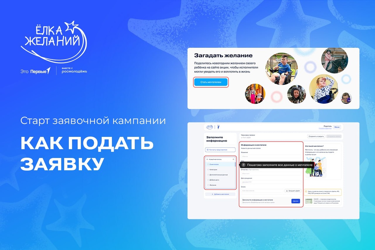 Друзья, приём заявок открыт! 🎄 Рассказываем, как создать заявку, чтобы заветное желание вашего ребёнка скорее исполнилось! ❗Перед подачей заявки убедитесь, что анкета ребёнка не находится в архиве. Если анкета в архиве, обратитесь в Службу заботы с просьбой восстановить её. 1️⃣ Шаг 1. Создание заявки В личном кабинете нажмите на кнопку «Создать заявку». Внимательно ознакомьтесь со всеми пунктами условий проведения акции в этом году. Отметьте галочкой, что ознакомились с условиями, и нажмите «Перейти к заявке». 2️⃣ Шаг 2. Заполнение заявки - Если ранее вы заполнили раздел «Анкеты детей», у вас откроется специальное окно - выберете в нём одного ребёнка и нажмите на кнопку «Выбрать мечтателя». Либо добавьте нового мечтателя не из анкеты, нажав на кнопку «Добавить нового мечтателя». Так, в заявку добавятся предзаполненные ранее данные из анкеты ребёнка, их нужно проверить и заполнить оставшиеся поля. - Если ранее вы не заполняли раздел «Анкеты детей», заполните блок «Контакты предста