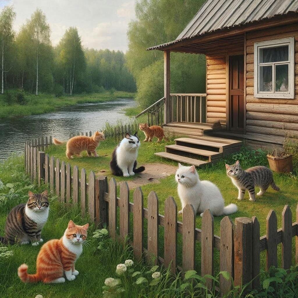 Стоит у речушки с лесом рядом Один уютный большой дом. И во дворе за деревянною оградой Там целый мир кошачий в нем. Есть в доме полосатая трусишка Мышей мы зовем её всегда. Рядом с ней живёт её братишка- Хулиган Мурзилка его звать. С ними еще беленькая кошка Лунюшка - охотница мышей. Ловит мышек прямо под окошком И несёт хозяйке их скорей. А ещё есть Барсик полосатый Милый белопузый толстячок. Ходит, как начальник он усатый И команды взглядом раздает. А недавно с ними поселился Маленький Дымарик-озорник. Он хотел со всеми подружиться Звал играть с собою каждый миг. Но коты и Кошки не спешили... Что им до пушистого щегла? Разве себе братика просили? Нужен он, как пятая нога. Только Барсик был не против крошки. Не гонял,не обижал его. Постепенно и другие кошки Попривыкнув приняли его. Вот теперь живут и бед не знают Пять хвостов под крышею одной. Молоко из мисочек лакают. Ловят мышек вместе под окном. Спят колбаской,рогликом,ватрушкой На диване плюшевом большом. Воду ночью пьют с хоз
