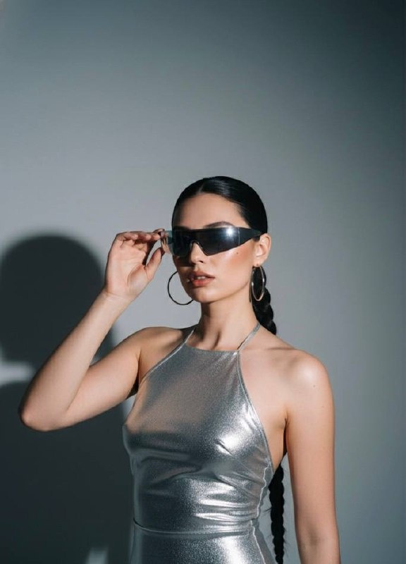 Девушки, вот такие шикарные фото можете себе сделать с помощью Nano Banana – вам нужно загрузить свое фото и этот промт: Используя моё фото как основу, создай кинематографичный портрет. Студийный редакционный портрет в уверенной подаче. Модель поправляет футуристичные очки формы cat-eye. Халтер металлик серебристого цвета, большие кольца-серьги, длинная одиночная коса. Жёсткий свет на фоне гладкой серой стены, за спиной легкий ореол тени. Снято на Canon 50 мм f1.4 Резкий направленный свет, выбитые бликами участки на ткани, чёткие границы теней. Видна матовая текстура кожи, лёгкий блеск на ключицах. Кадр немного «напряжён»: пальцы частично обрезаны по краю. На фоне заметен слабый цифровой шум, в тенях — едва уловимое зерно. Баланс белого слегка холодит картинку. Неровный тон кожи на груди и плече. Стиль — RAW. Без размытия, водяных знаков, текста или искажённых лиц.