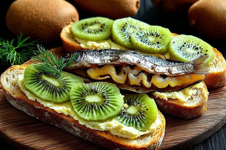 Шпроты – неизменный фаворит среди закусок, особенно на торжественных мероприятиях. Предлагаем праздничные канапе со шпротами и киви – свежий взгляд на новогодние угощения. Хотите поразить гостей необычной и быстро приготавливаемой закуской? Эти бутерброды вас приятно удивят! Изумительное сочетание мягкого плавленого сыра, острого чеснока, кисло-сладкого киви и копченых шпрот создает восхитительную игру вкусов. Прекрасный выбор для фуршета или быстрого перекуса с кофе. Начните с подготовки основы: нарежьте багет на кусочки средней толщины. Два куриных яйца сварите вкрутую и измельчите на мелкой терке вместе с плавленым сыром. Добавьте измельченный зубчик чеснока и заправьте майонезом до получения однородной, нежной массы. Равномерно распределите сырную пасту по ломтикам багета. Сверху поместите по тонкому кружку очищенного киви – его легкая кислинка отлично оттеняет насыщенный вкус шпрот. Завершите, украсив каждый бутерброд шпротами и небольшим количеством свежей зелени. Секрет