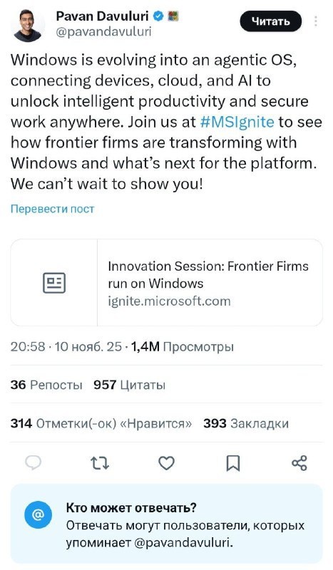 В Twitter разразился крупный скандал из-за нововведений в Windows. Президент подразделения Windows и Devices в Microsoft, Павлан Давулури, опубликовал стандартное приглашение на конференцию MS Ignite, где компания делилась своими свежими идеями о Windows. Это был типичный PR-текст, однако Twitter неожиданно отреагировал бурно, и пост собрал миллион просмотров. Комментаторы в реплаях писали, что «всем наплевать на ваши ИИ-агенты», «я разочарован в ИИ», «впервые с 1982 года перешёл на Mac с Windows» и «верните нам дизайн Windows 7». В целом пользователи критиковали встроенный ИИ Copilot, неэффективные обновления Windows, неудобный интерфейс и многое другое. После двух дней активного обсуждения и ироничных комментариев Давулури не удалил свой твит, но закрыл к нему реплики. Постмейкер - автоматическое ведение канала 🤖 Анимация | СhatGPT-4 | Помощь с резюме