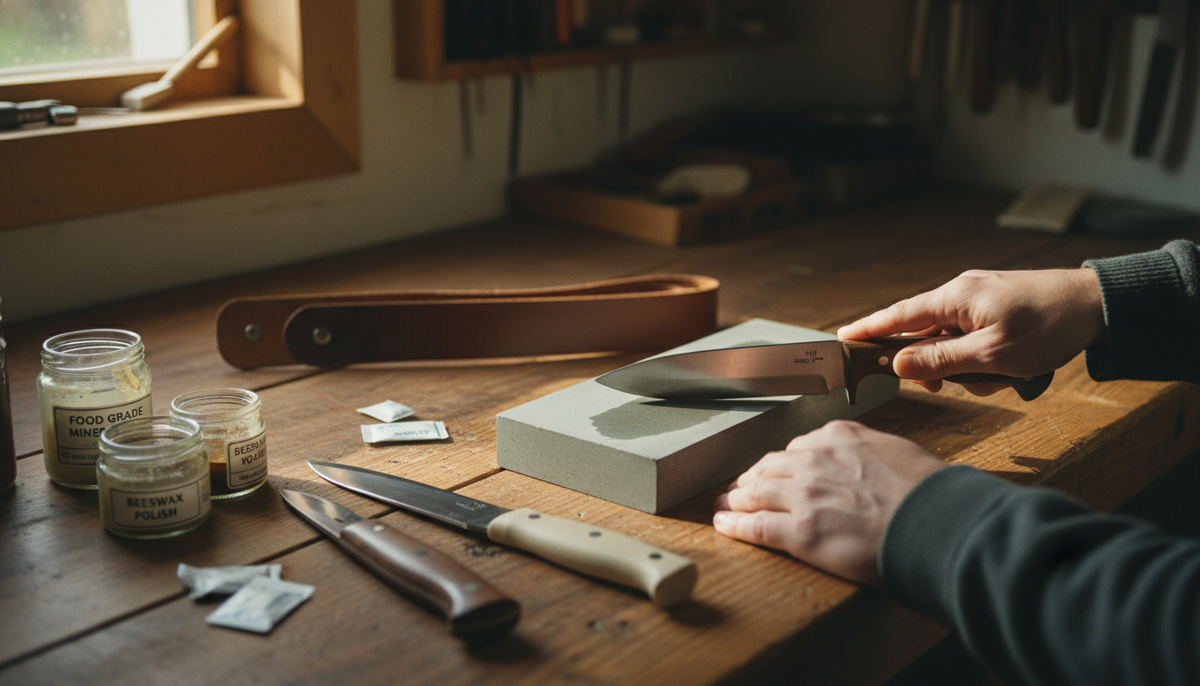 - Кожа: смягчайте специальным бальзамом; не храните мокрый нож в кожаной ножне — это источник плесени и ржавчины.