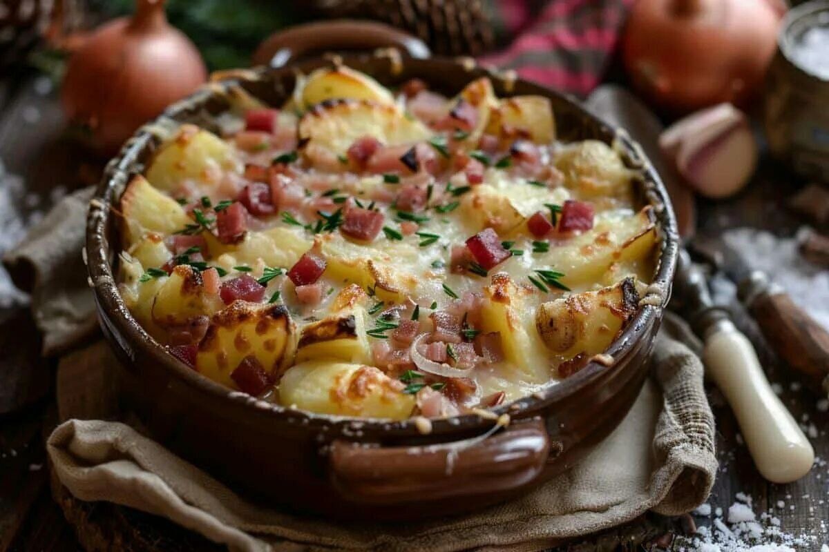 Тартифлет (Tartiflette) — традиционное французское блюдо родом из региона Савойя, известное своим насыщенным вкусом и аппетитностью. Это запеканка из картофеля, сыра реблошон, бекона и лука-шалота, приготовленная в духовке. Блюдо простое в приготовлении, но требует качественных ингредиентов, особенно свежего и ароматного сыра реблошон. Ингредиенты: - Картофель — 800 г - Сыр Реблошон — 250 г - Бекон — 200 г - Лук шалот — 2 шт. - Чеснок — 2 зубчика - Молоко — 100 мл - Масло сливочное — 30 г - Белое сухое вино — 50 мл - Свежемолотый черный перец - Морская соль Рекомендации по выбору продуктов: - Картофель: лучше всего выбирать сорта с высоким содержанием крахмала («желтый картофель»), такие как розовая картошка или семилуна, они хорошо держат форму и не разваливаются при варке. - Сыр Реблошон: выбирайте свежий сыр с выраженным ароматом и мягкой консистенцией. Если достать настоящий французский реблошон сложно, можно заменить на бри или камамбер, хотя вкус будет немного отличаться.