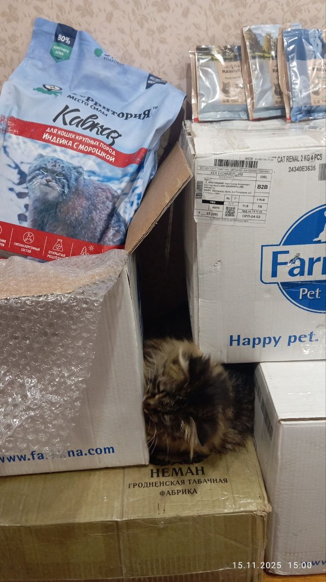 🐾Получили сегодня заказанный сухой корм. Все 11 мешков по 5 кг. А ещё нам положили в подарок три пакетика корма для стерилизованных кошек. 🐾 Мякиш проверяет все ли на месте? 🐾 Он у нас первый всегда. Все пакеты проверит. 😁