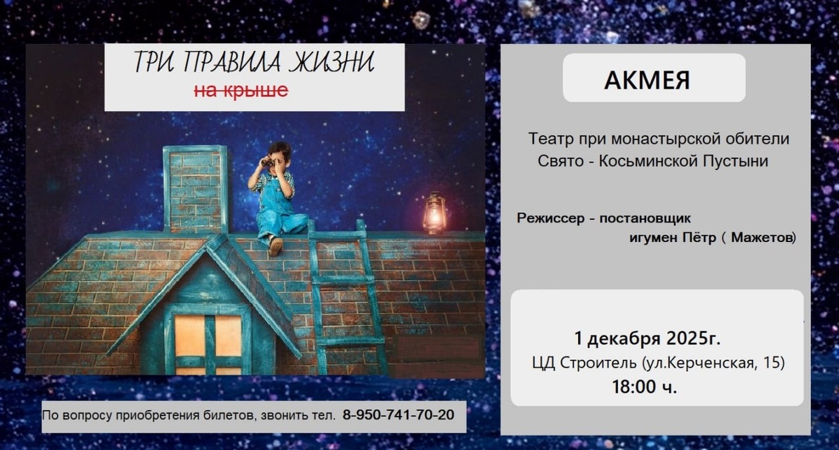 Приглашаем вас на уникальное театральное мероприятие! Впервые в Миассе театр «АКМЕЯ», руководитель и режиссер-постановщик — настоятеля Мужского монастыря Свято-Косьминской Пустыни (Верхотурье, д.Костылево). Это не просто спектакль, а путешествие в глубины души. Одноактная пьеса, основанная на весьма реальной, печально-радостной, далеко не детской правде ребенка. Будем рады видеть вас на этом значимом культурном событии.