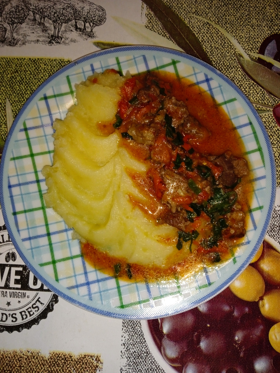 Для приготовления гуляша вам понадобится: говядина - 1кг., лук репчатый - 1 шт., морковь средняя - 1 шт., чеснок - несколько зубочков, мука - 1 ст. ложка, томат или томатная паста, сметана, растительное масло, соль, специи, вода. Говядину нарезать на мелкие кусочки, желательно поперек волокон. В глубокую сковороду налить немного растительного масла, раскалить масло,высыпать говядину, посолить. Сначала говядина выделит сок и будет тушится в собственном соку. Когда сок выкипит и мясо начнет зажариваться, добавьте натертую на крупной терке морковь и мелко нарезанный лук. Перемешайте. Добавьте мелконарезанный чеснок и специи. У меня смесь перцев и паприка. Перемешайте. Когда овощи станут мягкими, добавьте столовую ложка муки, перемешайте и влейте воду, не прекращая помешивание. Вода должна закрыть мясо полностью. Тушить до готовности мяса, регулярно помешивая. Когда мясо готово, добавить томат, у меня домашний, около стакана. Если готовите с томатной пастой, то 1 столовую ложку пасты смеш