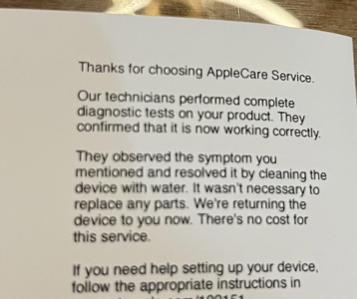 Вот уж точно, «а вы по колесу стучали?» На форуме Reddit публикуют ответ АСЦ Apple, согласно которому устройство обслужили по гарантии AppleCare бесплатно, а все работы свелись к... мойке с помощью воды. В целом, решение годное, вот только пользователь сдавал часы Apple Watch с жалобой на... быстрый разряд аккумулятора. 😂 @fixed